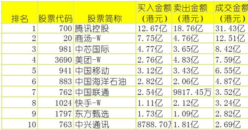 亚汇网4月12日港股通数据统计显示:腾讯控股成交额居首,达31.43亿港元