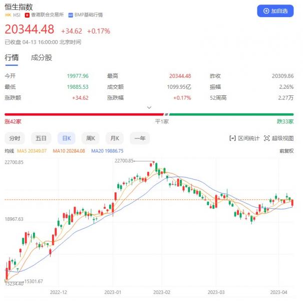 香港恒生指数开盘跌1.63%。早盘大幅低开,随后跌幅有所收窄,尾盘则实现翻红。截至收盘,恒生指数涨0.17%或34.62点,报20344.48点,全日成交额1099.95亿港元;恒生国企指数涨0.13%,报6875.45点;恒生科技指数跌0.17%,报4159.85点。
