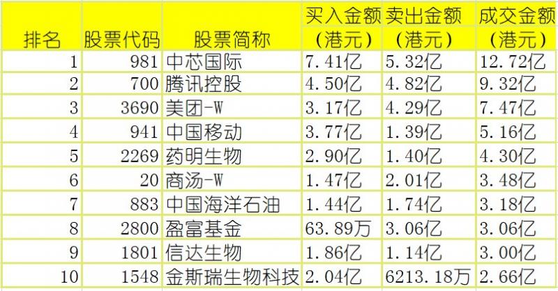 亚汇网实时数据统计:截至4月14收盘,恒生中国企业、中芯国际、腾讯控股(沪)成交前三,中芯国际、腾讯控股、美团—W(深)成交前三。