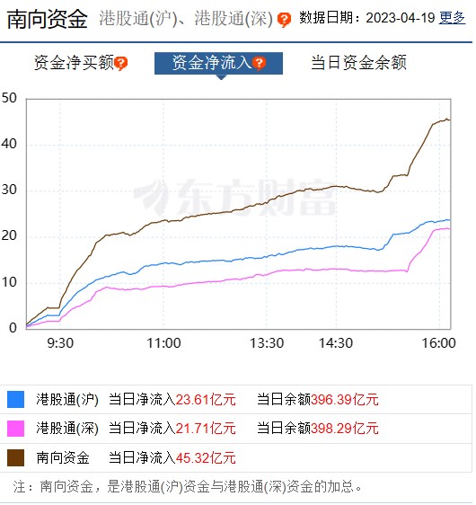 截至4月19日港股收盘,南向资金全日合计净流入逾45.32亿港元。其中,沪市港股通净流入23.61亿港元,深市港股通净流入21.71亿港元。