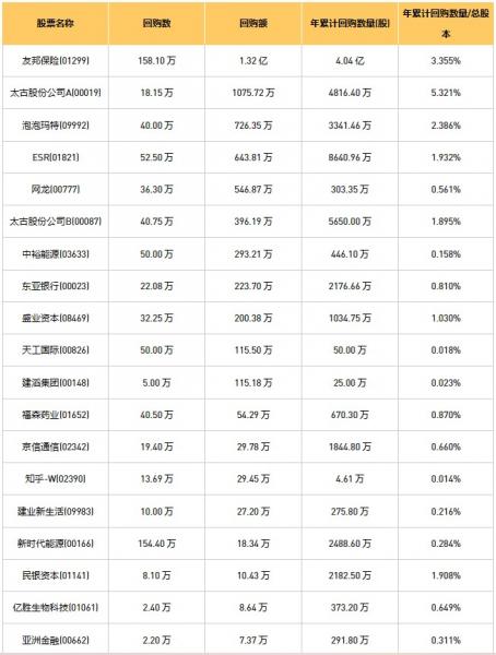 亚洲金融(00662)、亿胜生物科技(01061)、摩比发展(00947)、泡泡玛特(09992)、东亚银行(00023)、中裕能源(03633)、新时代能源(00166)、天福(06868)、民银资本(01141)、京信通信(02342)、网龙(00777)、建滔集团(00148)、建业新生活(09983)、乐声电子(00213)、友邦保险(01299)、盛业资本(08469)、太古股份公司A(00019)、太古股份公司B(00087)、天工国际(00826)、ESR(01821)、康圣环球(09960)、福森药业(01652)、知乎-W(02390)于2023年4月26日进行了回购。其中,回购金额最大的为友邦保险(01299),回购数量158.10 万,回购金额1.32 亿元。