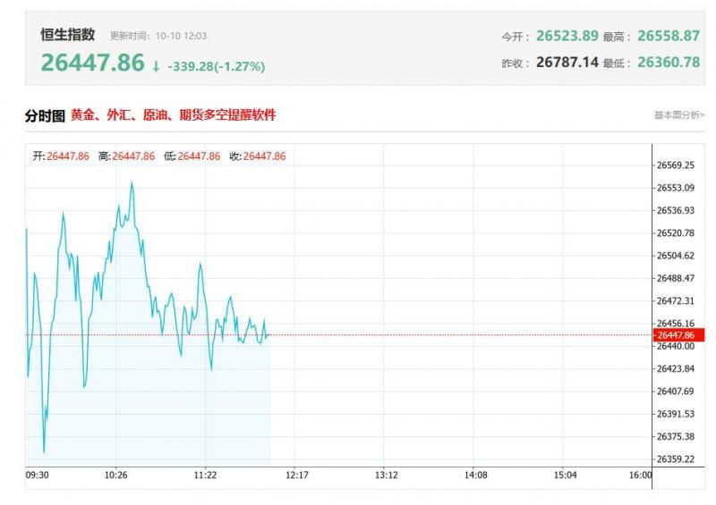 港股上午盘三大指数集体下挫,恒生科技指数跌幅最大,午间收跌2.45%险守6300点,恒生指数、国企指数分别下跌1.14%及1.2%,恒指、恒科指均录得5连跌行情。盘面上,作为市场风向标的大型科技股集体走低,其中,百度跌5.5%,阿里巴巴跌近4%,腾讯、小米跌近3%,京东、美团跌超1%;半导体芯片股、锂电池股、黄金股等热门板块全线回落,其中,赣锋锂业跌超8%,宁德时代跌超7%,中芯国际、中国黄金国际跌幅明显;苹果概念股、光伏股、稳定币概念股、濠赌股、生物医药股、汽车股纷纷下跌。另一方面,餐饮等消费概念股逆势上涨,小菜园、奈雪的茶、百胜中国均走强,煤炭股、燃气股、电信股、内房股、海运股、保险股多数表现活跃。此外,两只新股今日登陆港股市场,金叶国际集团大涨466%,挚达科技大涨183%。