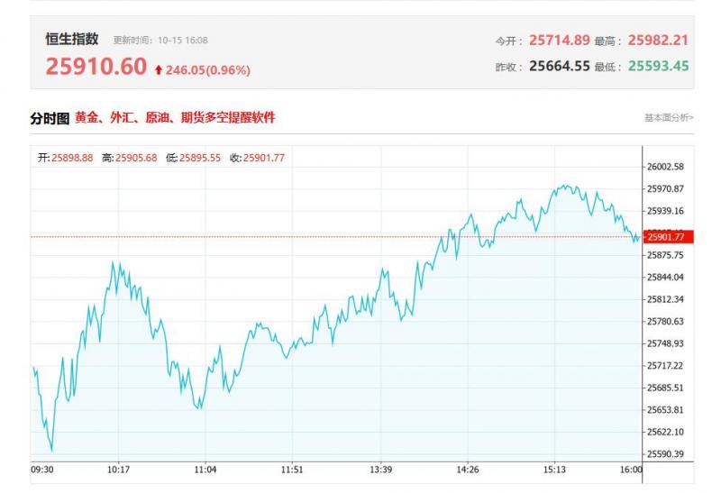 香港恒生指数10月15日(周三)收盘上涨469.25点,涨幅1.84%,报25910.6点;