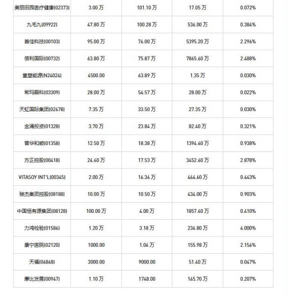 方正控股(00418)、摩比发展(00947)、网龙(00777)、希玛眼科(03309)、VITASOY INT'L(00345)、蒙牛乳业(02319)、信利国际(00732)、固生堂(02273)、归创通桥-B(02190)、碧桂园服务(06098)、天福(06868)、普华和顺(01358)、燕之屋(01497)、首佳科技(00103)、安东油田服务(03337)、联易融科技-W(09959)、力鸿检验(01586)、中旭未来(09890)、小米集团-W(01810)、康宁杰瑞制药-B(09966)、重塑能源(N24024)、金涌投资(01328)、绿城管理控股(09979)、骏杰集团控股(08188)、乐华娱乐(02306)、北森控股(09669)、九毛九(09922)、心玮医疗-B(06609)、康臣药业(01681)、美丽田园医疗健康(02373)、中电光谷(00798)、天虹国际集团(02678)、中国恒有源集团(08128)、云工场(N23027)、康宁医院(02120)于2025年10月16日进行了回购。其中,回购金额最大的为小米集团-W(01810),回购数量400.00 万,回购金额1.92 亿元。