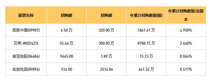 名创优品(09896)、百胜中国(09987)、诺亚控股(06686)、贝壳-W(02423)于2025年12月26日进行了回购。其中,回购金额最大的为百胜中国(09987),回购数量6.50 万,回购金额320.00 万元。