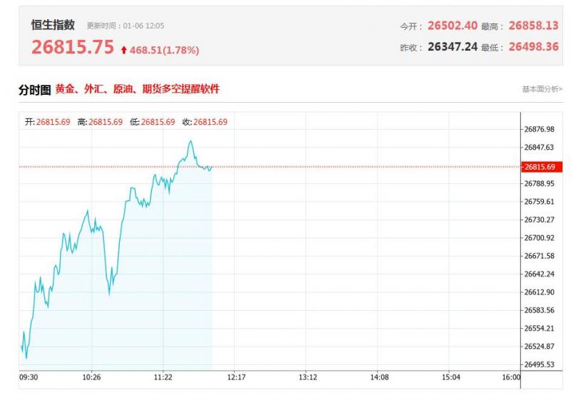 港股上午盘三大指数高开高走,涨势如虹!恒生科技指数首当其冲,午间收涨2.21%,恒生指数、国企指数分别上涨1.78%及1.61%,恒指上扬近500点有望冲击27000点大关。大型科技股普遍走强,京东、腾讯、百度涨超2%;地缘因素引爆大宗狂欢,有色金属股集体大涨,铜业股涨幅居前,中资券商股、保险股等金融权重拉升助力大市上扬。另外,昨日大涨的脑机接口概念股走低,风电股继续下跌。