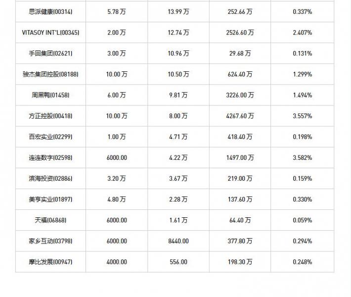 摩比发展(00947)、石四药集团(02005)、方正控股(00418)、吉利汽车(00175)、绿城服务(02869)、百宏实业(02299)、信利国际(00732)、富智康集团(02038)、滨海投资(02886)、天福(06868)、宝胜国际(03813)、腾讯控股(00700)、VITASOY INT'L(00345)、威高股份(01066)、瑞声科技(02018)、津上机床中国(01651)、加科思-B(01167)、中视金桥(00623)、小米集团-W(01810)、易点云(02416)、永升服务(01995)、同方友友(01868)、明源云(00909)、金风科技(02208)、周黑鸭(01458)、联易融科技-W(09959)、思派健康(00314)、天伦燃气(01600)、融创服务(01516)、叮当健康(09886)、名创优品(09896)、东阳光药(06887)、多点数智(02586)、巨子生物(02367)、德康农牧(02419)、美亨实业(01897)、九毛九(09922)、北森控股(09669)、手回集团(02621)、捷利交易宝(08017)、中国心连心化肥(01866)、连连数字(02598)、绿茶集团(06831)、骏杰集团控股(08188)、朝聚眼科(02219)、KEEP(03650)、康臣药业(01681)、家乡互动(03798)、天立国际控股(01773)、荃信生物-B(02509)于2026年1月6日进行了回购。其中,回购金额最大的为腾讯控股(00700),回购数量100.30 万,回购金额6.36 亿元。