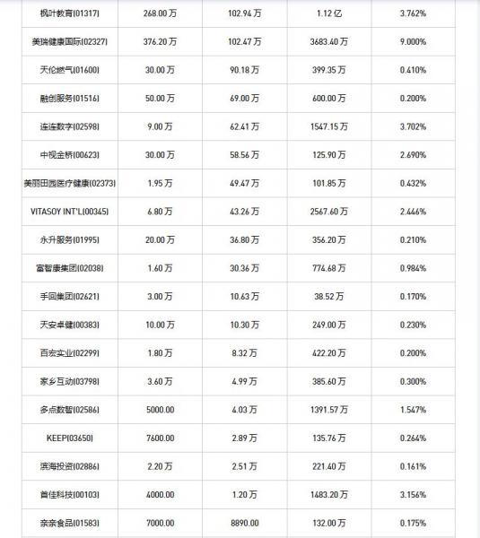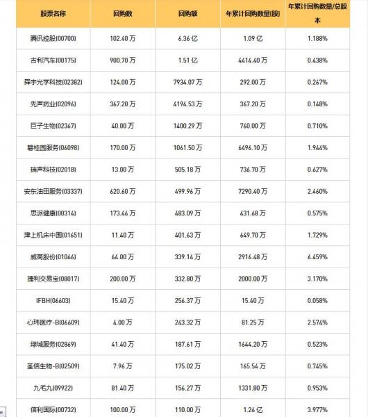 吉利汽车(00175)、富智康集团(02038)、信利国际(00732)、威高股份(01066)、舜宇光学科技(02382)、百宏实业(02299)、绿城服务(02869)、捷利交易宝(08017)、心玮医疗-B(06609)、瑞声科技(02018)、同方友友(01868)、亲亲食品(01583)、中视金桥(00623)、腾讯控股(00700)、滨海投资(02886)、津上机床中国(01651)、天福(06868)、永升服务(01995)、VITASOY INT'L(00345)、融创服务(01516)、天伦燃气(01600)、首佳科技(00103)、碧桂园服务(06098)、美亨实业(01897)、天安卓健(00383)、思派健康(00314)、家乡互动(03798)、枫叶教育(01317)、九毛九(09922)、新百利融资(08439)、叮当健康(09886)、KEEP(03650)、连连数字(02598)、美瑞健康国际(02327)、多点数智(02586)、安东油田服务(03337)、美丽田园医疗健康(02373)、绿茶集团(06831)、先声药业(02096)、巨子生物(02367)、IFBH(06603)、荃信生物-B(02509)、手回集团(02621)于2026年1月12日进行了回购。其中,回购金额最大的为腾讯控股(00700),回购数量102.40 万,回购金额6.36 亿元。