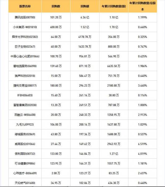 富智康集团(02038)、舜宇光学科技(02382)、绿城服务(02869)、百宏实业(02299)、瑞声科技(02018)、IGG(00799)、威高股份(01066)、滨海投资(02886)、融创服务(01516)、知行科技(01274)、信利国际(00732)、心玮医疗-B(06609)、首佳科技(00103)、天福(06868)、碧桂园服务(06098)、微泰医疗-B(02235)、小米集团-W(01810)、永升服务(01995)、中视金桥(00623)、腾讯控股(00700)、百融云-W(06608)、天伦燃气(01600)、捷利交易宝(08017)、思派健康(00314)、九毛九(09922)、中国心连心化肥(01866)、叮当健康(09886)、美亨实业(01897)、心动公司(02400)、KEEP(03650)、巨子生物(02367)、亚洲联网科技(00679)、九源基因(02566)、朝聚眼科(02219)、IFBH(06603)、绿茶集团(06831)、手回集团(02621)、荃信生物-B(02509)、连连数字(02598)于2026年1月13日进行了回购。其中,回购金额最大的为腾讯控股(00700),回购数量101.20 万,回购金额6.36 亿元。