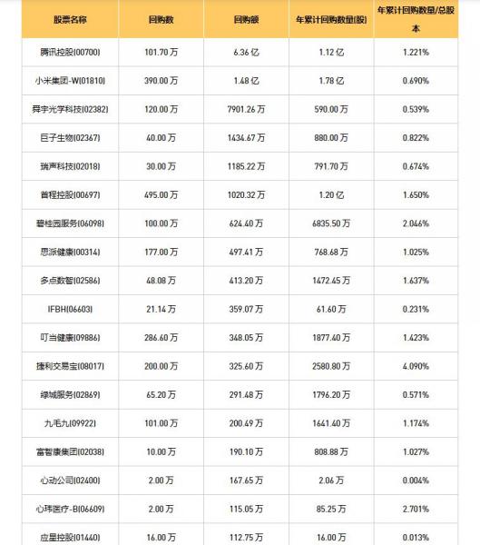 摩比发展(00947)、富智康集团(02038)、联易融科技-W(09959)、绿城服务(02869)、中国恒有源集团(08128)、中视金桥(00623)、浩德控股(08149)、舜宇光学科技(02382)、同方友友(01868)、瑞声科技(02018)、巨子生物(02367)、腾讯控股(00700)、天伦燃气(01600)、威高股份(01066)、首程控股(00697)、碧桂园服务(06098)、永升服务(01995)、思派健康(00314)、首佳科技(00103)、小米集团-W(01810)、九毛九(09922)、玄武云(02392)、心玮医疗-B(06609)、燕之屋(01497)、朝聚眼科(02219)、天润云(02167)、多点数智(02586)、应星控股(01440)、KEEP(03650)、枫叶教育(01317)、心动公司(02400)、叮当健康(09886)、手回集团(02621)、绿茶集团(06831)、捷利交易宝(08017)、华检医疗(01931)、天立国际控股(01773)、亚洲联网科技(00679)、连连数字(02598)、荃信生物-B(02509)、家乡互动(03798)、IFBH(06603)于2026年1月15日进行了回购。其中,回购金额最大的为腾讯控股(00700),回购数量101.70 万,回购金额6.36 亿元。