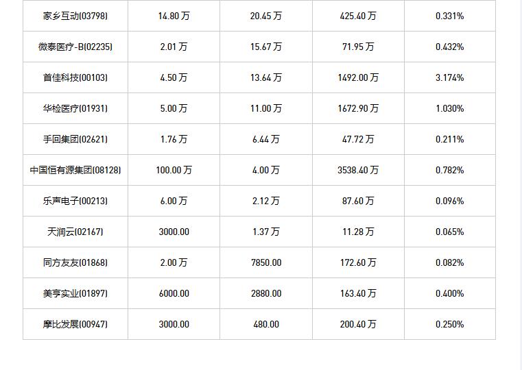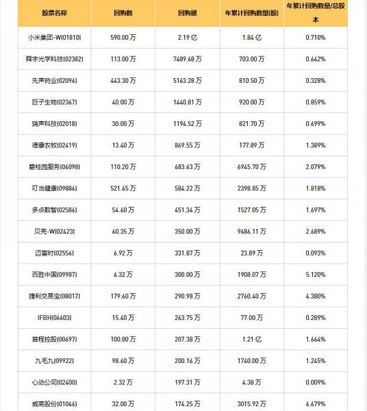 摩比发展(00947)、永升服务(01995)、天润云(02167)、威高股份(01066)、舜宇光学科技(02382)、融创服务(01516)、中视金桥(00623)、永安国际(00289)、中国恒有源集团(08128)、瑞声科技(02018)、信利国际(00732)、同方友友(01868)、首程控股(00697)、微泰医疗-B(02235)、碧桂园服务(06098)、乐声电子(00213)、天伦燃气(01600)、美亨实业(01897)、九毛九(09922)、首佳科技(00103)、玄武云(02392)、亚洲联网科技(00679)、美瑞健康国际(02327)、先声药业(02096)、巨子生物(02367)、友和集团(02347)、德康农牧(02419)、小米集团-W(01810)、KEEP(03650)、健康之路(02587)、叮当健康(09886)、心动公司(02400)、绿茶集团(06831)、迈富时(02556)、连连数字(02598)、IFBH(06603)、捷利交易宝(08017)、华检医疗(01931)、荃信生物-B(02509)、永达汽车(03669)、手回集团(02621)、多点数智(02586)、天立国际控股(01773)、百胜中国(09987)、家乡互动(03798)、诺亚控股(06686)、名创优品(09896)、贝壳-W(02423)于2026年1月16日进行了回购。其中,回购金额最大的为小米集团-W(01810),回购数量590.00 万,回购金额2.19 亿元。