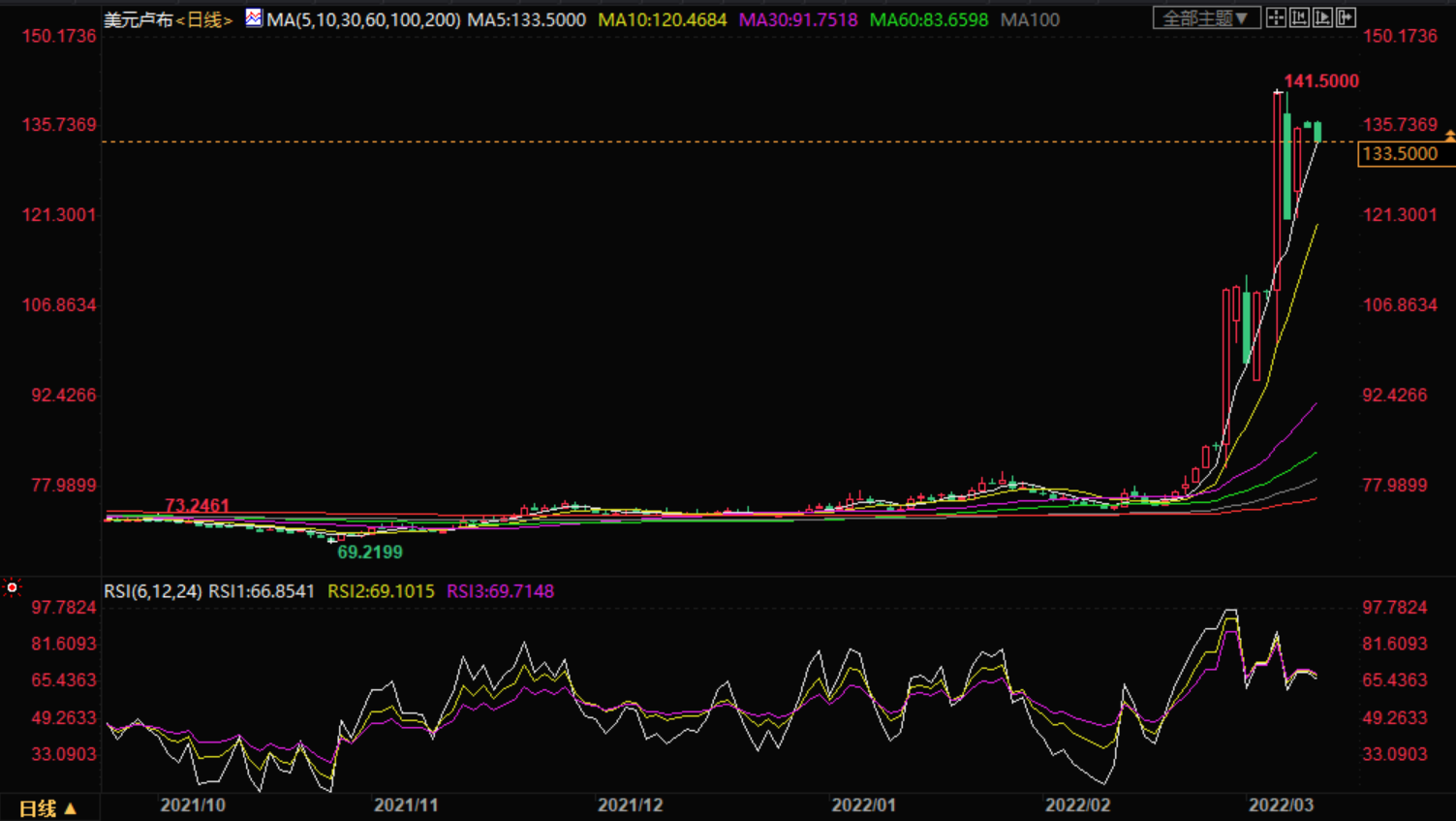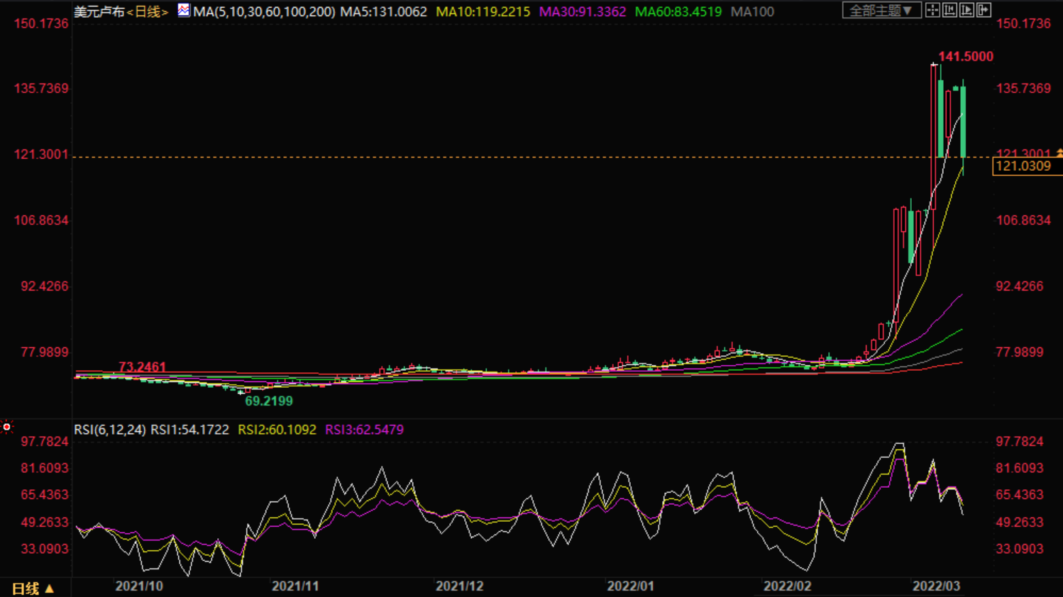 今日卢布实时汇率分析 周四,卢布汇率继续下跌,兑美元汇率跌至120比1,截止目前美元兑卢布下跌至120.20,跌幅11.43%。进入今年以来,卢布对美元总体贬值了大约50%,其中2月24日至3月9日这段时间贬值了33%。 日内,美元/卢布交易者将密切关注在土耳其举行的乌克兰-俄罗斯会谈,希望有一个积极的结果。如果出现这种情况