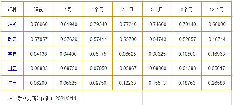 1个月LIBOR:瑞郎报-0.79340%,欧元报-0.57414%,英镑报0.05175%,日元报-0.07950%,美元报0.09750%。