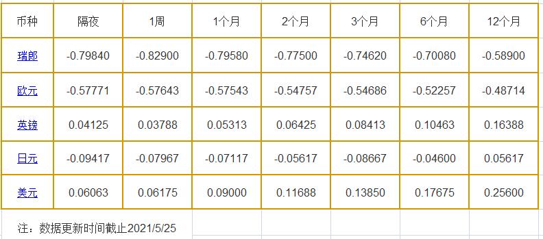 隔夜LIBOR:瑞郎报-0.79840%,欧元报-0.57771%,英镑报0.04125%,日元报-0.09417%,美元报0.06063%;