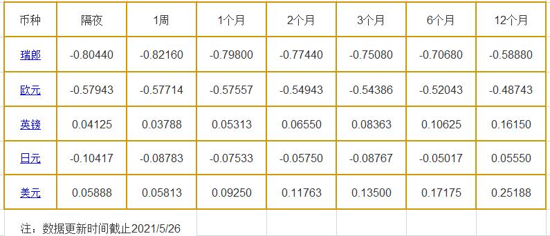隔夜LIBOR:瑞郎报-0.80440%,欧元报-0.57943%,英镑报0.04125%,日元报-0.10417%,美元报0.05888%;