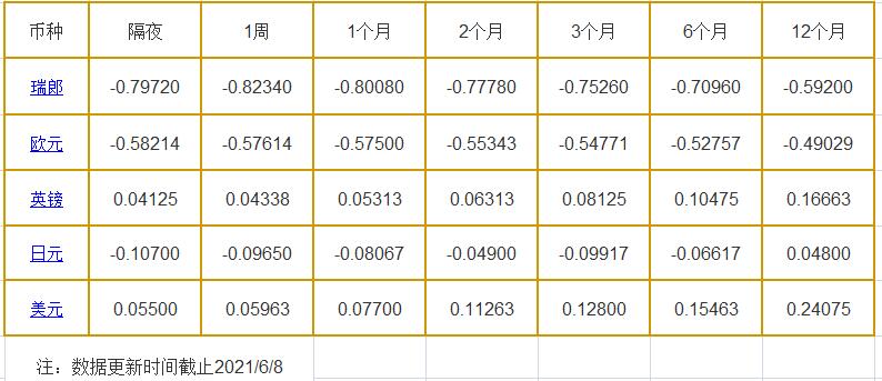 1个月LIBOR:瑞郎报-0.80080%,欧元报-0.57500%,英镑报0.05313%,日元报-0.08067%,美元报0.07700%。