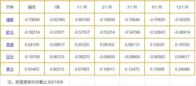 隔夜LIBOR:瑞郎报-0.79840%,欧元报-0.58214%,英镑报0.04150%,日元报-0.10700%,美元报0.05463%;