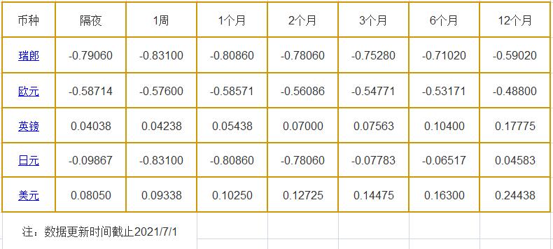 1个月LIBOR:瑞郎报-0.80860%,欧元报-0.58571%,英镑报0.05438%,日元报-0.80860%,美元报0.10250%。