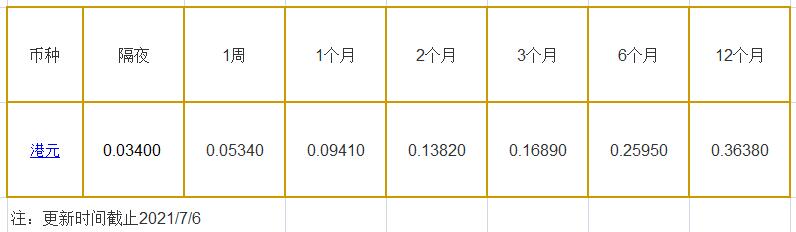 7月6日香港银行间同业拆借利率港币: