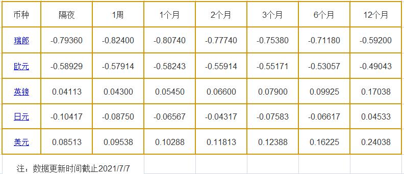 隔夜LIBOR:瑞郎报-0.79360%,欧元报-0.58929%,英镑报0.04113%,日元报-0.10417%,美元报0.08513%;