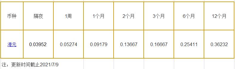 7月9日香港银行间同业拆借利率港币: