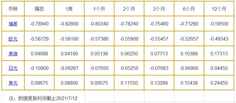 隔夜LIBOR:瑞郎报-0.78940%,欧元报-0.58729%,英镑报0.04088%,日元报-0.10900%,美元报0.08675%;
