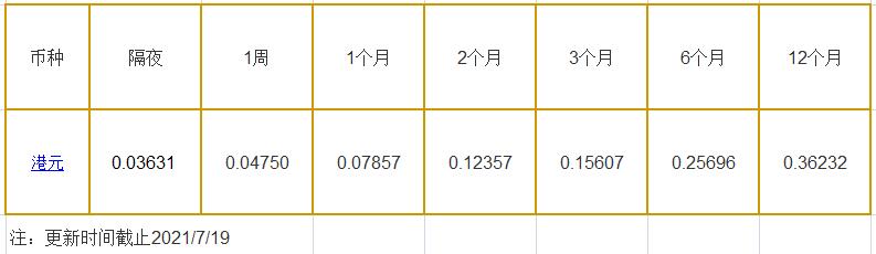 7月19日香港银行间同业拆借利率港币: