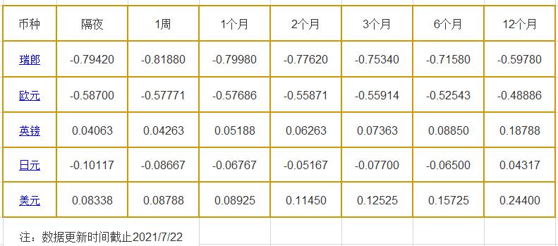 1周LIBOR: 瑞郎报-0.81880%,欧元报-0.57771%,英镑报0.04263%,日元报-0.08667%,美元报0.08788%;