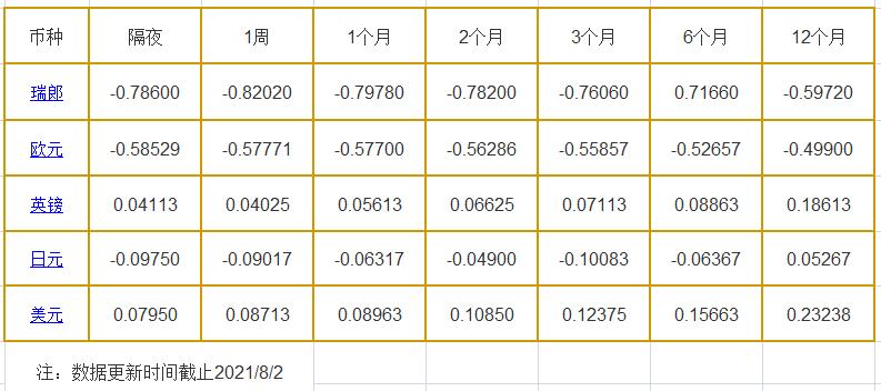 隔夜LIBOR:瑞郎报-0.78600%,欧元报-0.58529%,英镑报0.04113%,日元报-0.09750%,美元报0.07950%;