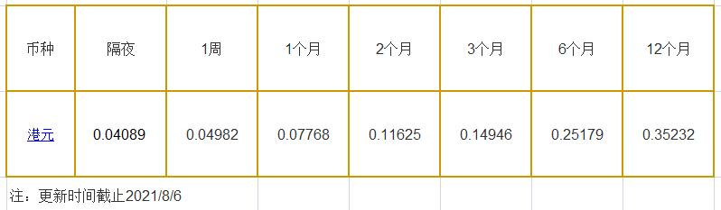 8月6日香港银行间同业拆借利率港币: