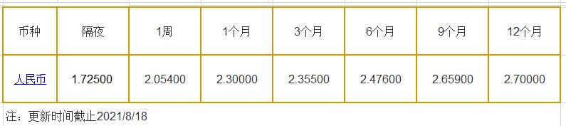 中国银行同业拆放利率(China Interbank Offered Rate,简称CHIBOR)。同业拆借利率指金融机构同业之间的短期资金借贷利率。它有两个利率,拆进利率表示金融机构愿意借款的利率;拆出利率表示愿意贷款的利率。