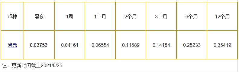 8月25日香港银行间同业拆借利率港币: