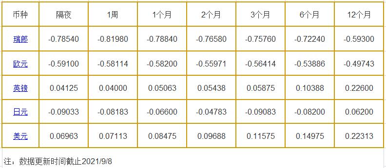 1周LIBOR: 瑞郎报-0.81980%,欧元报-0.58114%,英镑报0.04000%,日元报-0.08183%,美元报0.07113%;