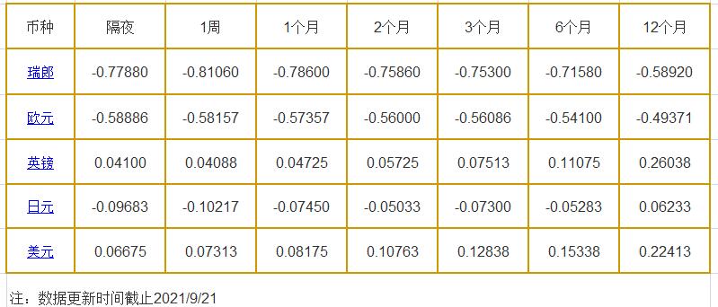 1个月LIBOR:瑞郎报-0.78600%,欧元报-0.57357%,英镑报0.04725%,日元报-0.07450%,美元报0.08175%。