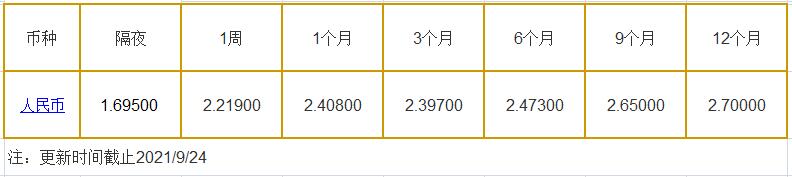 9月24日中国银行间同业拆借利率人民币: