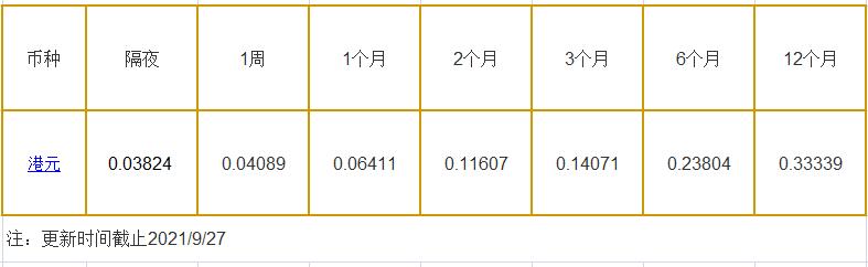 9月27日香港银行间同业拆借利率港币: