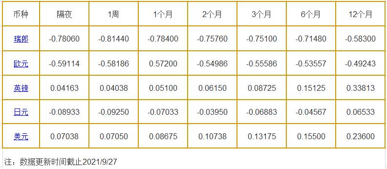 1周LIBOR: 瑞郎报-0.81440%,欧元报-0.58186%,英镑报0.04038%,日元报-0.09250%,美元报0.07050%;