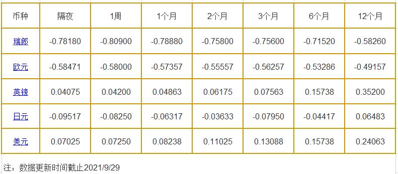 1个月LIBOR:瑞郎报-0.78880%,欧元报-0.57357%,英镑报0.04863%,日元报-0.06317%,美元报0.08238%。