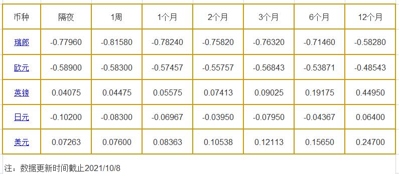 隔夜LIBOR:瑞郎报-0.77960%,欧元报-0.58900%,英镑报0.04075%,日元报-0.10200%,美元报0.07263%;