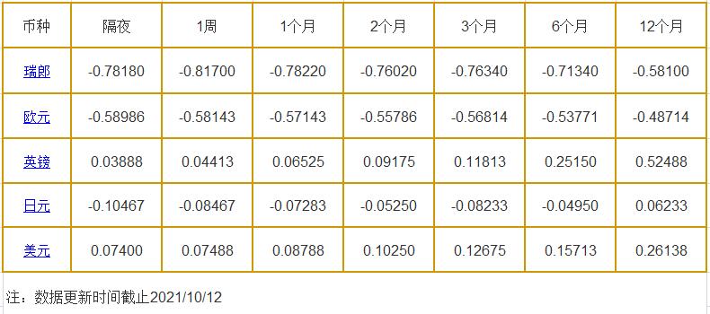 1个月LIBOR:瑞郎报-0.78220%,欧元报-0.57143%,英镑报0.06525%,日元报-0.07283%,美元报0.08788%。