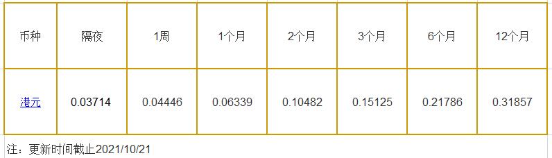 10月21日香港银行间同业拆借利率港币: