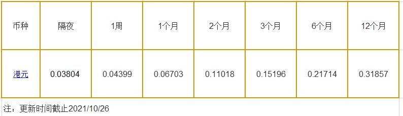 10月26日香港银行间同业拆借利率港币: