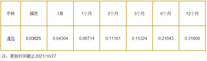 10月27日香港银行间同业拆借利率港币:
