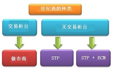 经纪商主要有两种类型:交易柜台型(DD)和非交易柜台型(NDD)。交易柜台经纪商也称为做市商,而非交易柜台经纪商可以进一步被细分为直通处理型(STP)和电子通讯网络加直通处理型(ECN+STP)。