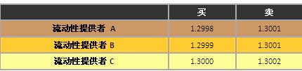 假设非交易柜台直通处理式经纪商有3个流动性提供者。在他们的体系中,他们将看到3组不同的买盘和卖盘报价。