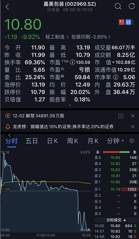 嘉美包装今日上演天地板,再现“杀猪盘”,9月9日,嘉美包装上演天地板,换手率达69%,成交金额8.25亿元,全天振幅20%!