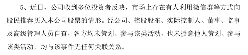 同时,泰嘉股份在公告中提及,近日收到多位投资者反映,市场上有“老师”通过微信群等方式推荐公司股票的事情发生。