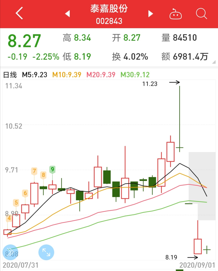 8月27日上午十点半左右,泰嘉股份几分钟内被暴力拉升至涨停,触及年内高点11.23元。随后股价放量下跌,最终收报10.11元。当日盘中最大振幅近12%,全天成交3.37亿元,换手达14.74%。次日,泰嘉股份开盘跌停,第三天股价收跌7.03%,三个交易日下跌17.1%。