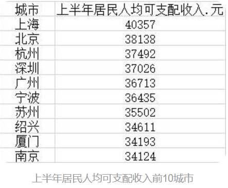 第一财经记者通过对各大城市(包括直辖市、省会城市、计划单列市和普通地级市)居民人均可支配收入统计梳理发现,2021年上半年,收入最高的10个城市分别是上海、北京、杭州、深圳、广州、宁波、苏州、绍兴、厦门和南京。
